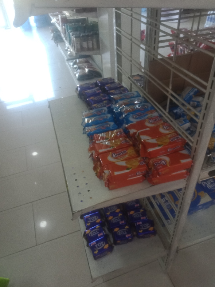 This image captures an interior view of a retail establishment located in Gandu Albasa, Nigeria. The scene is dominated by multiple white metal shelving units displaying various packaged food products. In the midground and foreground right, several shelves are stocked with commercially packaged biscuits. The topmost visible shelf contains rows of blue and white packages labeled "Cream." Below this, a prominent display of orange and white packages, also branded "Cream," is arranged. On the lowest visible shelf, dark blue packages marked "TOP" are uniformly stacked. To the right of these, partially obscured, are blue packages identified as "Pure Bliss." In the background left, another aisle with white shelving units holds various other products, some visible as jars or containers on upper shelves. The floor is covered with light-colored tiles, exhibiting reflections from an unseen light source. No individuals are visible, and no actions or interactions are depicted within the static scene.