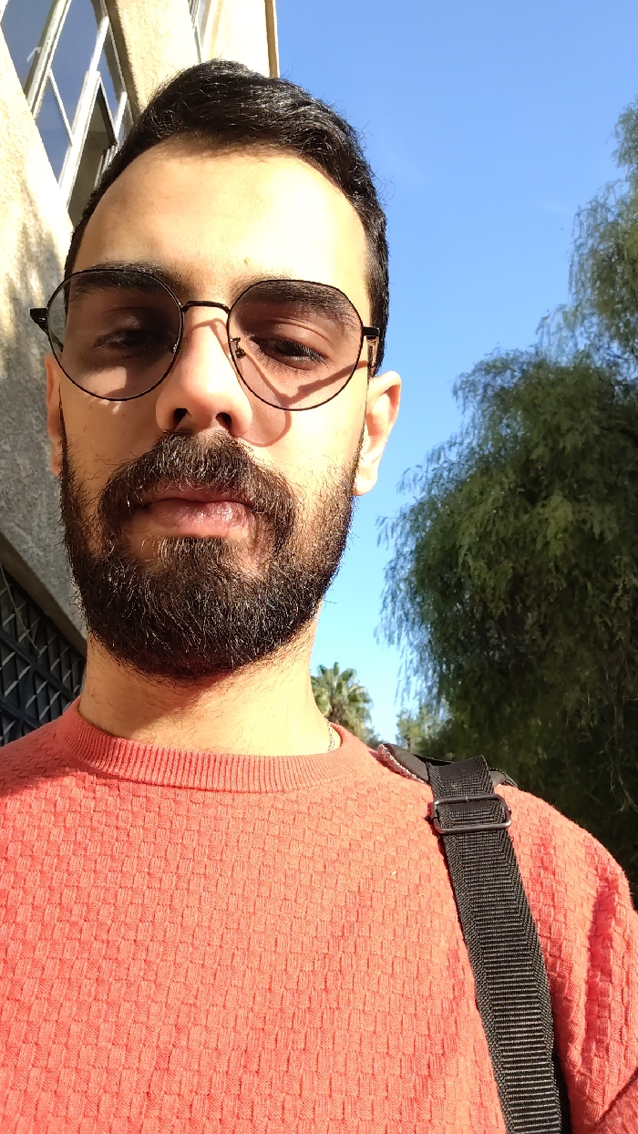 A man with a beard and mustache wears round-rimmed glasses and a textured orange sweater. A black shoulder bag strap crosses his body. The photo appears to be a selfie taken outdoors, with a building visible in the background, partially obscured by trees and a clear blue sky. Strong sunlight casts shadows on the man's face and the building.