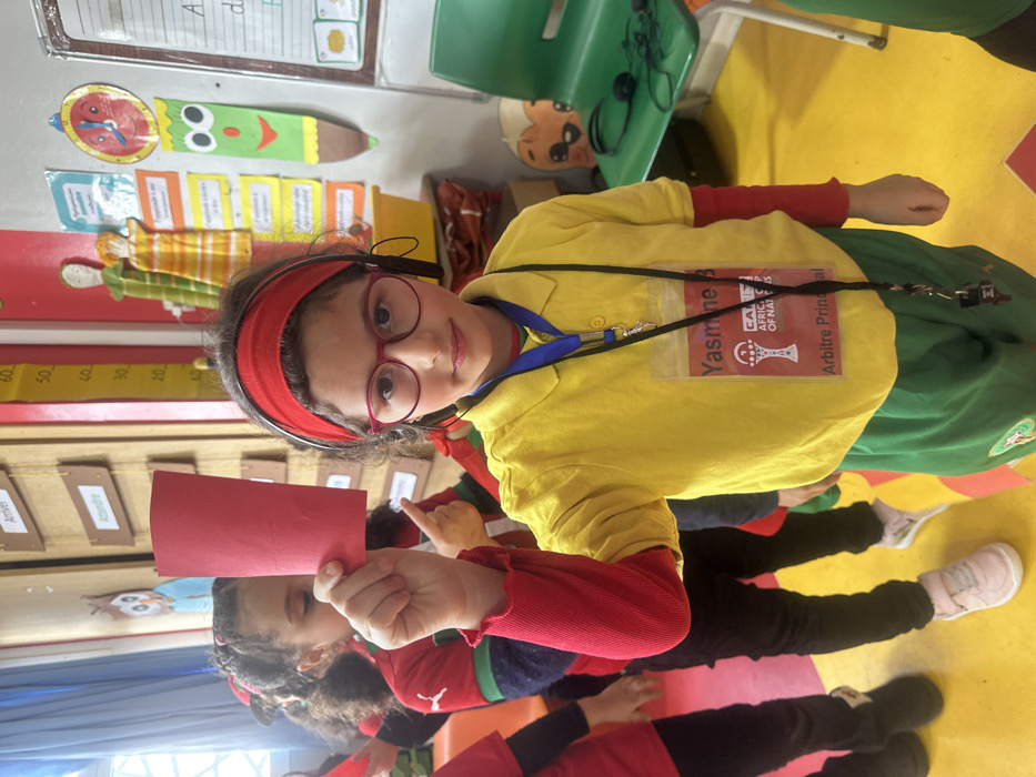 The scene depicts a brightly lit classroom located in Salé, Morocco. A young girl, identified by a badge as "Yasmine B," is centrally positioned in the foreground, facing the viewer with a slight smile. She wears a red headband, red-framed glasses, and black headphones. Her attire includes a yellow polo shirt layered over a red long-sleeved shirt and green shorts. A blue lanyard around her neck displays a clear plastic badge featuring the text "CAN 2023 AFRICA CUP OF NATIONS" and "Arbitre Principal" (Principal Referee), with a black whistle attached. Yasmine holds a rectangular piece of red paper aloft in her raised right hand. In the mid-ground, another young girl is partially visible behind Yasmine, also holding a piece of red paper. The background wall is yellow and adorned with various educational materials, including brown plaques labeled "Arriver" (Arrive) and "Attendre" (Wait), a tall numerical chart ranging from 0 to 60, colorful cutouts resembling string puppets, a smiling green character, and a red-faced clock. A white whiteboard with some writing is visible on the far right. A green plastic chair with a black headset resting on its seat is located to the right of Yasmine. The floor is predominantly yellow, featuring sections of red and orange. Natural light illuminates the room, originating from a window visible on the left side of the frame.