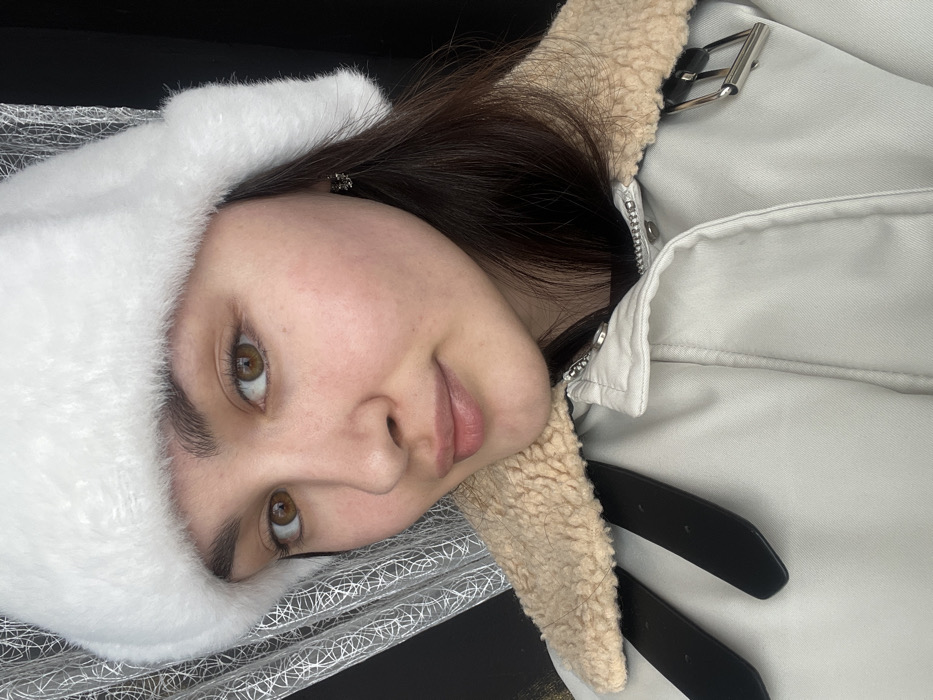 A young adult female is depicted in a close-up, chest-up portrait, facing forward with a slight smile and direct gaze. She has brown eyes, natural eyebrows, and visible light skin. Her dark hair is partially visible on the right side. She is wearing a white, fluffy winter hat, likely a ushanka style, and a light-beige or off-white jacket with a prominent cream-colored faux shearling collar. The jacket features black decorative straps with silver buckles on the front, and a silver zipper is visible at the neck. A small, dark earring is visible in her left ear. The background on the left consists of a light-colored curtain or screen with an abstract or leaf-like pattern. The background on the right is dark and indistinct. This scene occurs in Neftekamsk, Russia.
