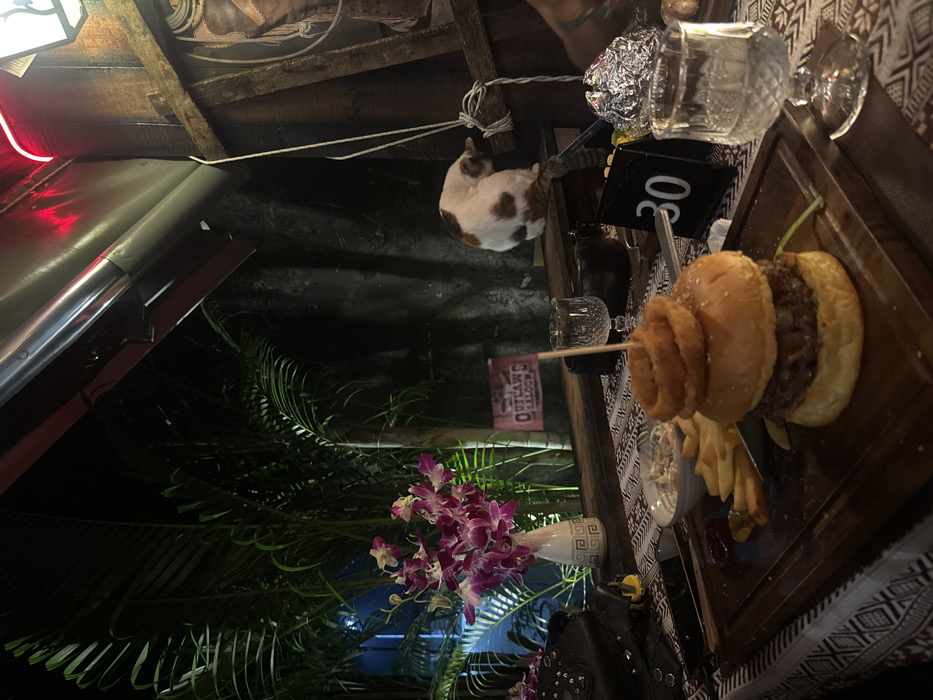 The scene depicts a nighttime dining setting in Moo 1, Thailand. A table in the foreground is covered with a patterned fabric and holds a meal. Centrally placed is a burger on a wooden serving board, topped with onion rings and a small flag marked "OUTLAW SALOON." Alongside the burger are french fries, a small white bowl of coleslaw, and portions of ketchup and mustard. Two clear, patterned water glasses are present. A black table number "30" stands upright. To the left, a white vase contains purple and white orchids, positioned next to a dark, studded bag and a mobile phone. A foil-wrapped item is visible to the right. In the midground, a white domestic cat with brown patches is perched on a dark wooden beam, facing away from the camera, exhibiting grooming behavior. A light-colored rope is tied to the wooden structure near the cat. The background features dark foliage, likely palm trees, with a distant blue light source. Overhead, a reflective metallic panel, a red neon light strip, and a rustic lantern attached to wooden beams are visible.