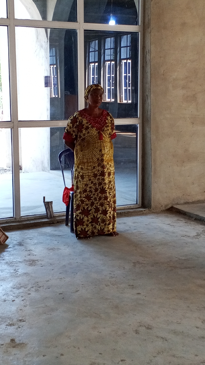 An adult female stands barefoot inside a building in Ogbono, Nigeria