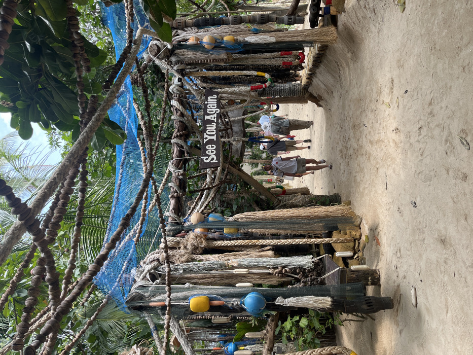 A beach walkway is decorated with nautical-themed objects, including fishing nets, ropes, and colorful buoys hanging from wooden beams. A sign reads "See You Again." Three people are walking through the decorated path on the sandy ground. Lush green trees and foliage are visible to the left of the walkway, while the sandy beach extends to the right.