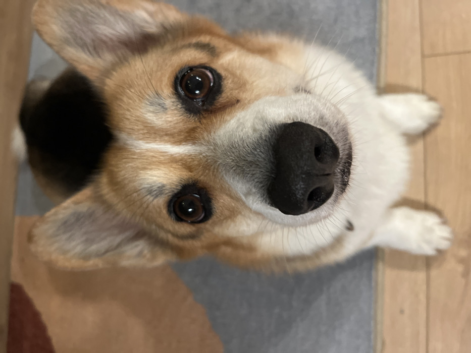 A close-up, upward-angled view captures a Pembroke Welsh Corgi. The dog's face is framed by pointed ears. Its fur displays a mix of tan, white, and black colors. Shiny, dark eyes and a large, wet nose dominate the view. White fur covers its chest and paws, which are partially visible. The background contains a grey rug and wooden flooring. The corgi's expression is endearing, suggesting affection and a desire for attention.