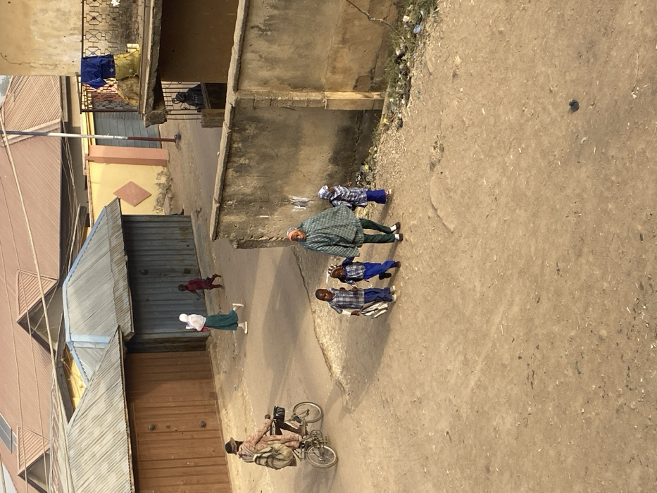 A street scene shows an adult in a green checkered jacket walking with three children in blue and white checkered outfits. An older man rides a bicycle in the lower left corner. A woman in a white hijab and green dress walks nearby. A small child in red crawls on the ground. Buildings with corrugated metal roofs and plastered walls line the street. Debris is visible along the edge of the road.