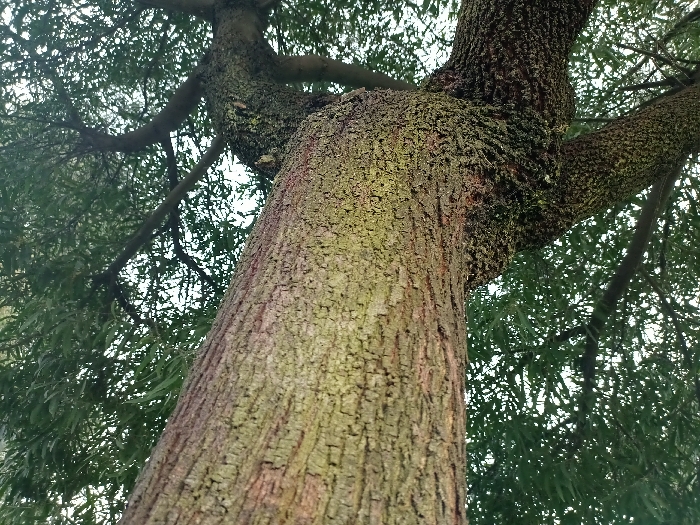 A low-angle shot captures a large tree trunk with rough, textured bark