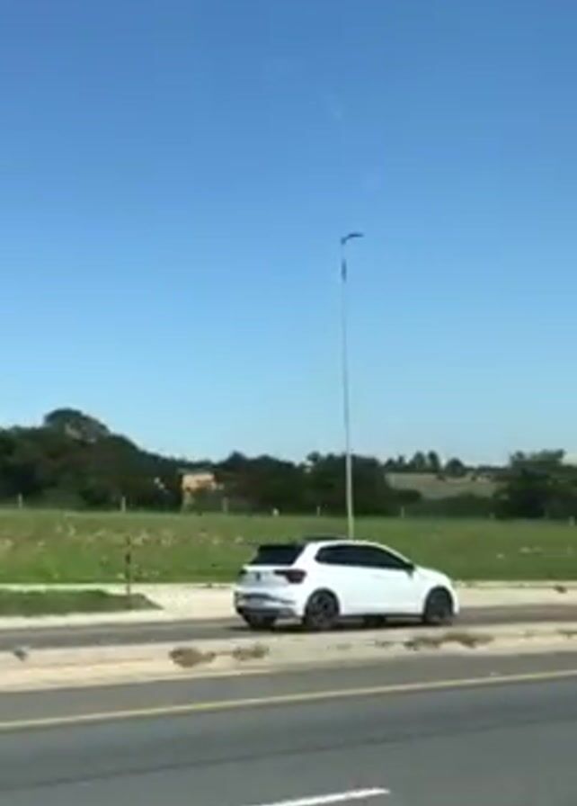 white car on the side of the road. The car is parked next to a sign with a black arrow pointing up and to the left. Beyond the car and sign, there is a field of green grass and trees, and a clear blue sky. The camera moves forward along the road.