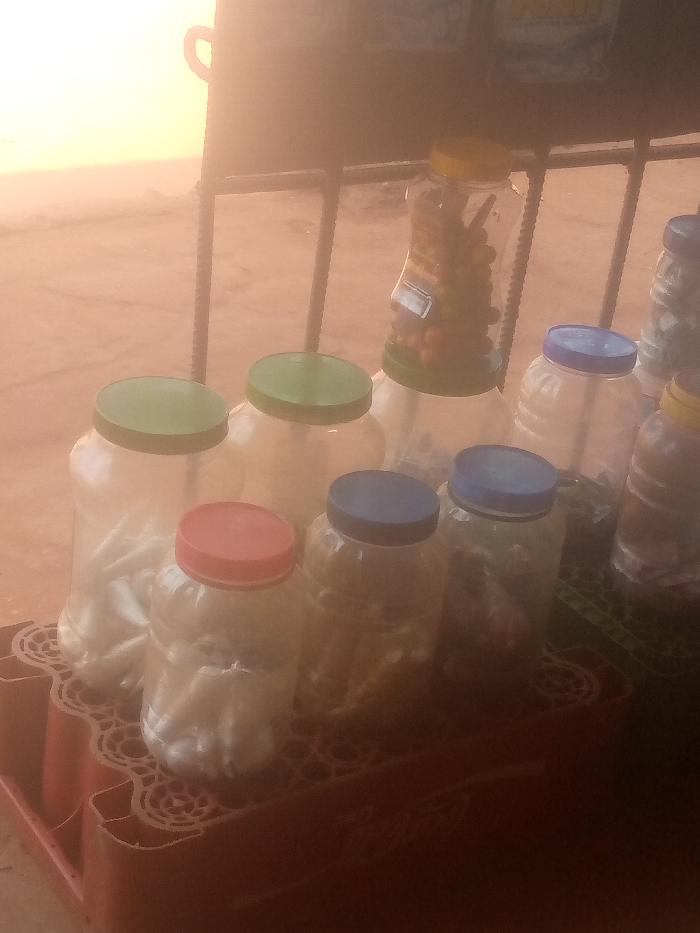 The scene depicts a collection of clear plastic containers displayed on red and dark green plastic crates, suggesting a vendor's stall or roadside market in Ogidi, Nigeria