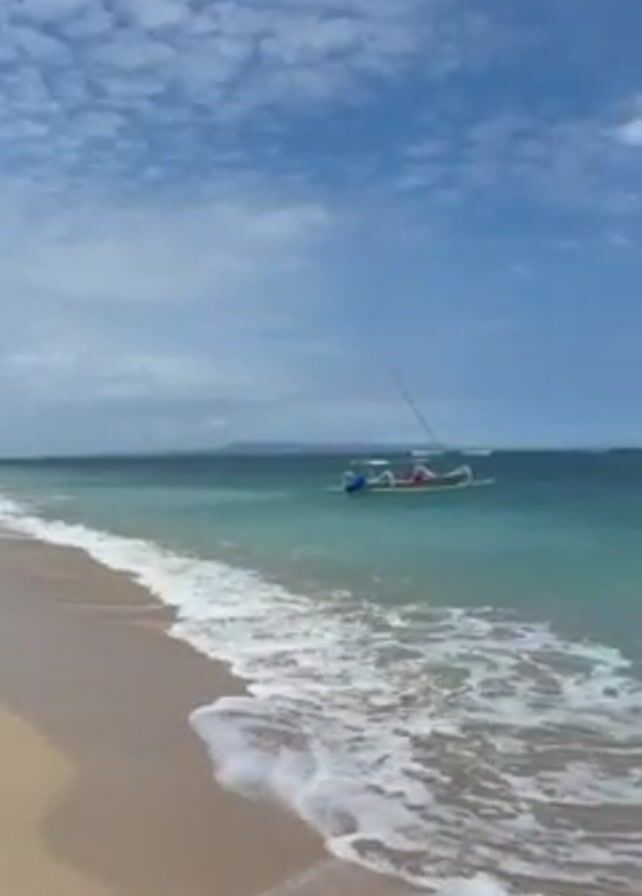 The scene captures a sunny beach with a boat in the distance. The beach has light brown sand meeting turquoise ocean waters. Small, white-tipped waves gently roll onto the shore. Above, a blue sky is scattered with puffy white clouds. Further out in the ocean, a small boat with a tall mast is visible, carrying people. The scene appears peaceful and bright.