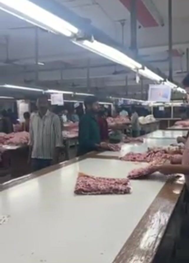 n interior scene of what appears to be a garment factory or textile production facility. Several workers are visible, most of whom are standing at long tables, handling and inspecting fabric pieces. The fabric has a patterned design, primarily in shades of red and pink on a light background. The tables are arranged in rows throughout the space. The lighting is provided by overhead fluorescent lights. Some workers are wearing casual clothing, while others are wearing plaid shirts. A few men seem to be supervising or moving between workstations. There are ceiling fans, and overall, the factory looks organized and busy. The sound in the video includes voices speaking.
