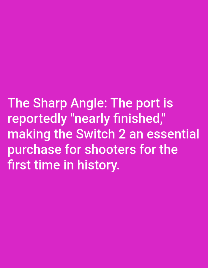 The image features text against a bright magenta background. The text reads "The Sharp Angle: The port is reportedly 'nearly finished,' making the Switch 2 an essential purchase for shooters for the first time in history." The information presented suggests anticipation or excitement about a specific video game port being completed for the Nintendo Switch 2, implying it will be a significant release for players who enjoy shooter games.