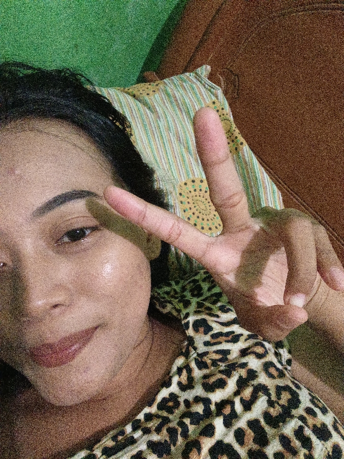 A close-up, high-angle image depicts an individual, appearing to be female, indoors in Kecamatan Pati, Indonesia. The subject's right eye, part of the nose, and lips are visible on the left side of the frame. The individual has dark hair and a small piercing on the left nostril. Their right hand is raised to the right side of their face, forming a "peace" sign with the index and middle fingers extended. The individual is wearing a brown and black leopard print garment. Behind the subject's head and hand, a pillow with a yellow, green, and white striped pattern, interspersed with yellow circular designs containing green dots, is visible. A solid brown surface, likely furniture, is behind the pillow, and a solid green wall forms the background. The image exhibits a grainy texture.