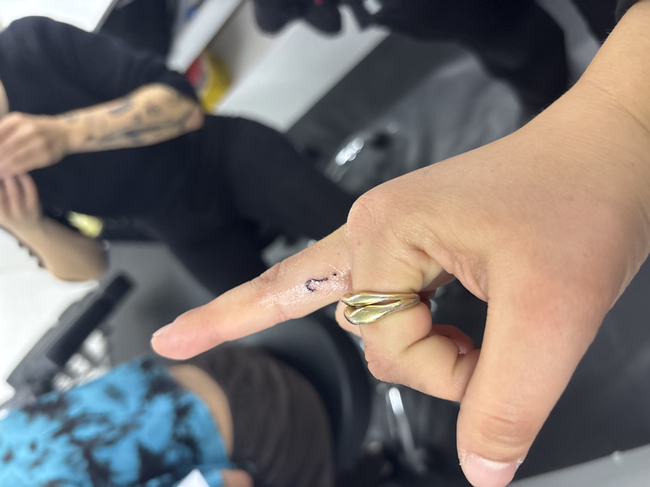 A person's hand is prominently displayed, showcasing a fresh tattoo on the side of the index finger
