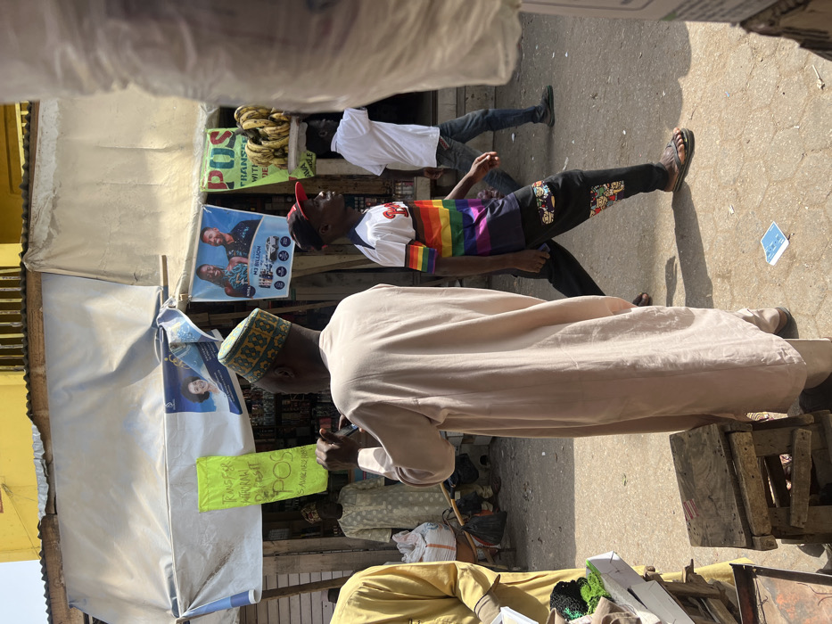 The image depicts a sunlit street scene in Fagge C, Nigeria, characterized by commercial activity