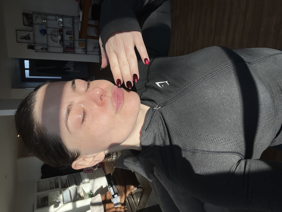 A single female subject is depicted indoors in an apartment in Roubaix, France. She has dark hair pulled back and her eyes are closed, with lips pursed in a kissing gesture, coated in clear gloss. Her right hand is raised, with fingers positioned near her mouth; her fingernails are painted with dark red glitter polish. She wears a dark grey long-sleeved athletic top with a quarter-zip, featuring a white Gymshark logo on the left chest. Strong directional sunlight illuminates the left side of her face and body, casting prominent shadows. The background includes a wooden floor, a white shelving unit with assorted items on the left, and a darker shelving unit with decorative objects and a table on the right. A dark doorway or window is visible in the far background.