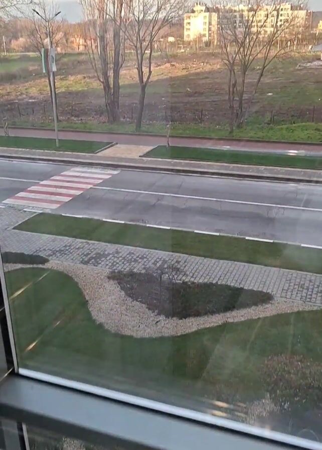 view from a high floor overlooking a street. A crosswalk is visible with red and white stripes. There is a grassy area with decorative landscaping between the window and the street. A silver car drives by on the street. Across the street is an undeveloped area with some trees and buildings in the distance. The sky is overcast. The camera pans up to give a better view of the scene. A voice says "Fourth floor."