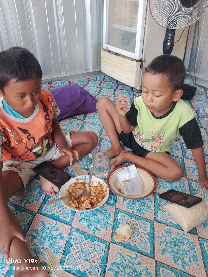 Two young boys sit cross-legged on a patterned floor mat. One wears an orange shirt and holds a phone, the other a green shirt. In front of them are a plate of food with a spoon, a glass with a straw, and another plate. A bag of rice and a piece of fruit sit nearby. A purple pillow rests behind the boy in orange. A white metal wall, a refrigerator and an electric fan are visible in the background. The lower left corner of the image shows a watermark.