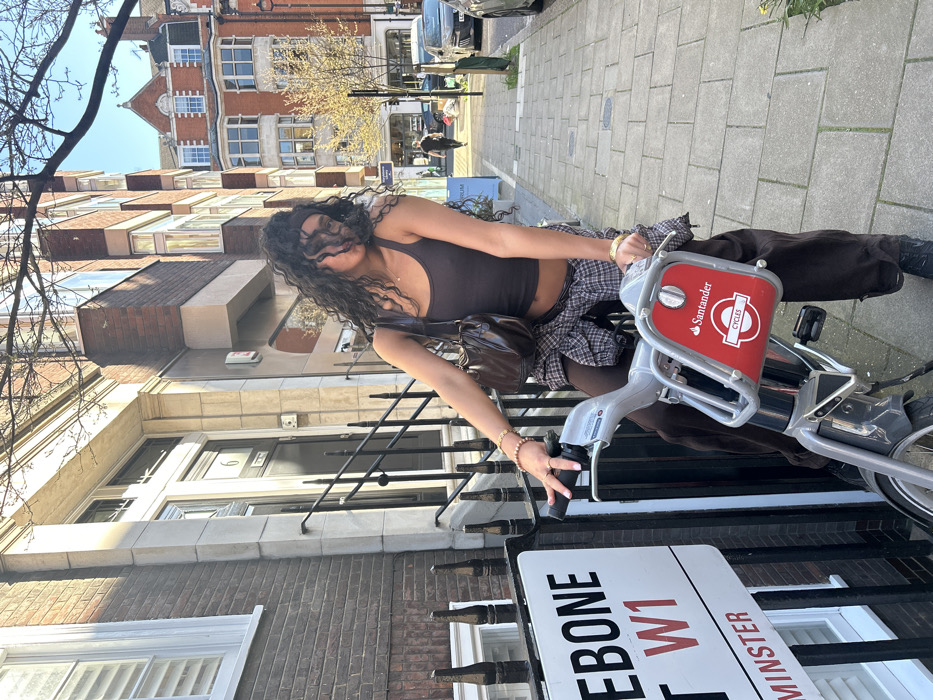 - "A street-level photograph depicts a young adult female posing with a silver-grey Santander Cycles bicycle on the paved sidewalk of Marylebone Street W1 in Westminster, London, United Kingdom" by FM-Cs9iO2, licensed under CC BY 4.0