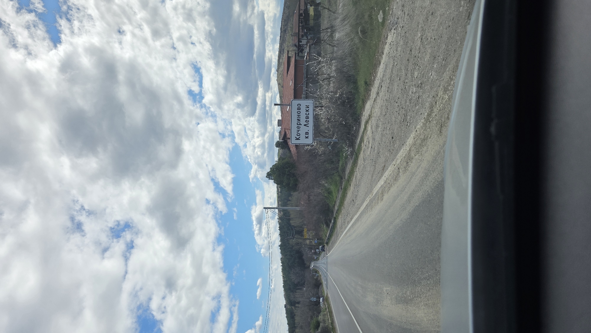 road leading into Kocherinovo, Bulgaria, as indicated by a road sign. The sky is partly cloudy. The road surface is asphalt and there is a rough shoulder on the right side of the road. Buildings are visible to the right of the sign. Forest covers an expanse of land on the left side of the road as it extends away from the viewer. The picture appears to have been taken from inside a vehicle.