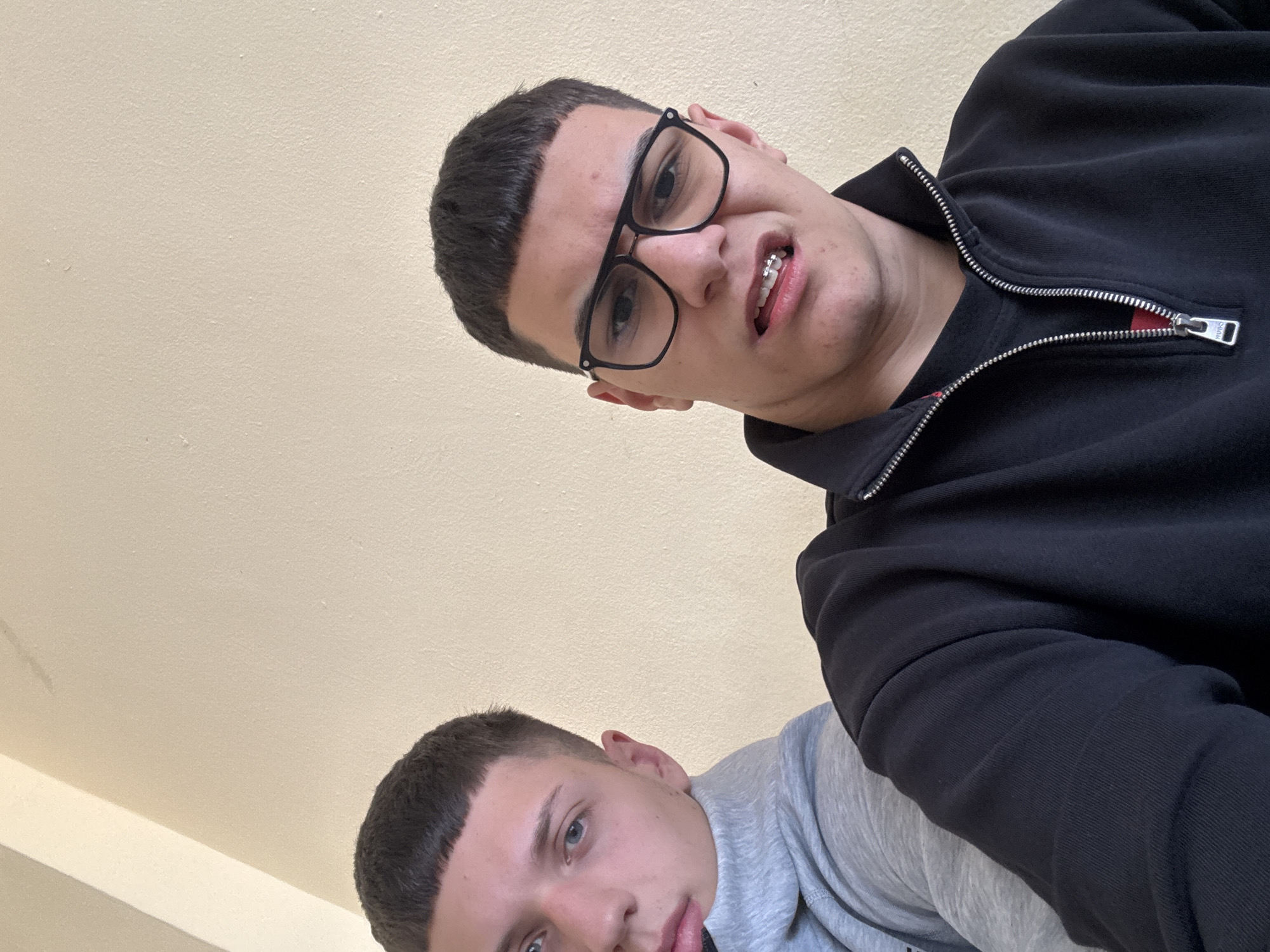 - "Two young males are depicted in a close-up, indoor setting against a plain, light beige wall" by FM-khGKX2, licensed under CC BY 4.0