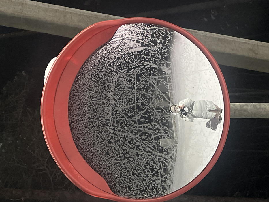 This image captures a convex mirror, encircled by a red frame, mounted on a light-colored pole. The mirror's upper and central reflective surfaces are extensively covered with intricate, dendritic frost patterns. Reflected in the lower section of the mirror is a lone individual, clad in a light-colored, knee-length puffer coat and white headphones. The person is holding a mobile phone with both hands, directed towards the mirror, indicative of a self-portrait. A distinct shadow from the individual extends onto the snow-covered ground visible in the reflection. The background, both within the mirror's reflection and partially outside its frame, reveals a dark, frost-covered forested or vegetated area under a night sky, with significant snow accumulation on the ground. The scene is located in the city of Finskiy Briz, Russia.