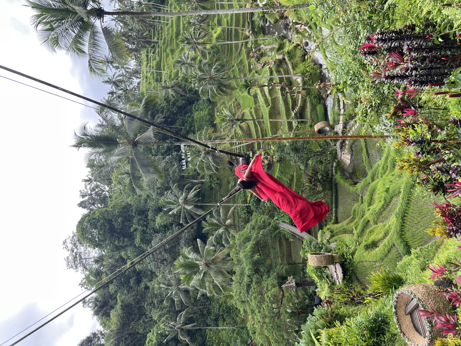 A woman in a red dress swings over a lush green landscape. Rice terraces cascade down the hills, dotted with palm trees. Dense foliage fills the background, with tropical flowers in the foreground. Suspension cables support the swing over the verdant scene. A sign reading "ALAS HARUM BALI" is partially visible in the distance.
