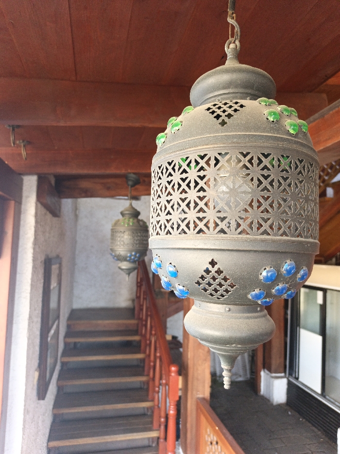 This image depicts an interior architectural space in Yevpatoriya, Ukraine, characterized by traditional design. A large, cylindrical, dark grey metal lantern hangs centrally in the foreground, suspended from a reddish-brown wooden plank ceiling by a metal hook. This lantern features intricate geometric lattice patterns, with approximately ten green glass cabochons adorning its upper circumference and ten blue glass cabochons on its lower section; an internal light bulb is visible within. In the mid-ground, a wooden staircase with reddish-brown handrails ascends from the lower-left. To the left of the staircase, a light-colored, textured wall displays a small, dark-framed rectangular opening. A second, smaller, ornate metal lantern, stylistically consistent with the foreground piece, hangs in the background above the staircase. To the right of the foreground lantern, a reddish-brown wooden balustrade extends, behind which a dark floor is visible, leading towards a large, dark-framed glass panel, potentially a door or window. The ceiling and structural supports are composed of exposed reddish-brown wooden beams and planks. Dust accumulation is present on the foreground lantern. No individuals are depicted in the scene.