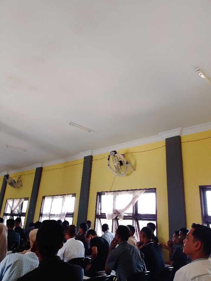 A gathering of people occupies a room with yellow walls and grey pillars. Sunlight filters through windows draped with white curtains. Wall-mounted fans provide ventilation. Fluorescent lights are affixed to the ceiling. The focus is on the backs of heads and shoulders of the attendees, suggesting a seated audience listening to someone or something not in view.