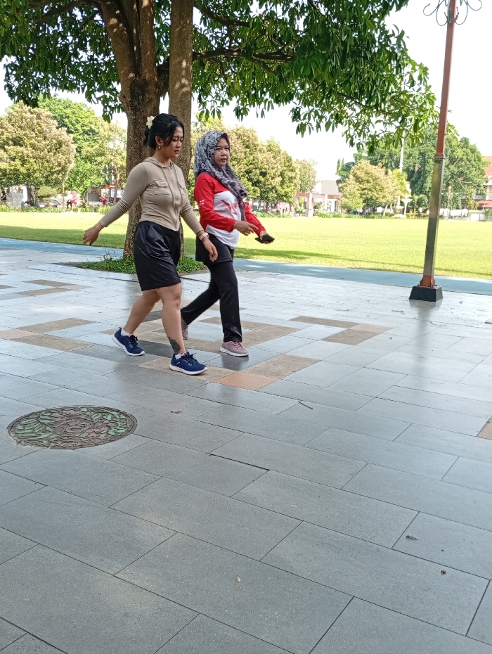 Two women stroll along a sidewalk. One is on the left, wearing a light-colored hoodie, black shorts, and blue sneakers. A white flower adorns her hair. The other woman, partially obscured, wears a red and white long-sleeved shirt, dark pants, and a patterned headscarf. They walk on a paved path near a grassy area with trees and buildings in the background. A manhole cover is visible in the foreground. A decorative lamppost is on the right.