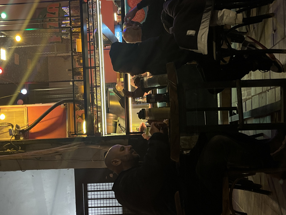 A bald man sits at a table outside a restaurant, looking upward toward people gathered around a window. Jars and bottles sit on the table. The restaurant has lights strung up and appears to be serving food through the window. Another man stands behind the table, partially obscured, also looking toward the restaurant window. A third person, partially out of frame, stands at the window.