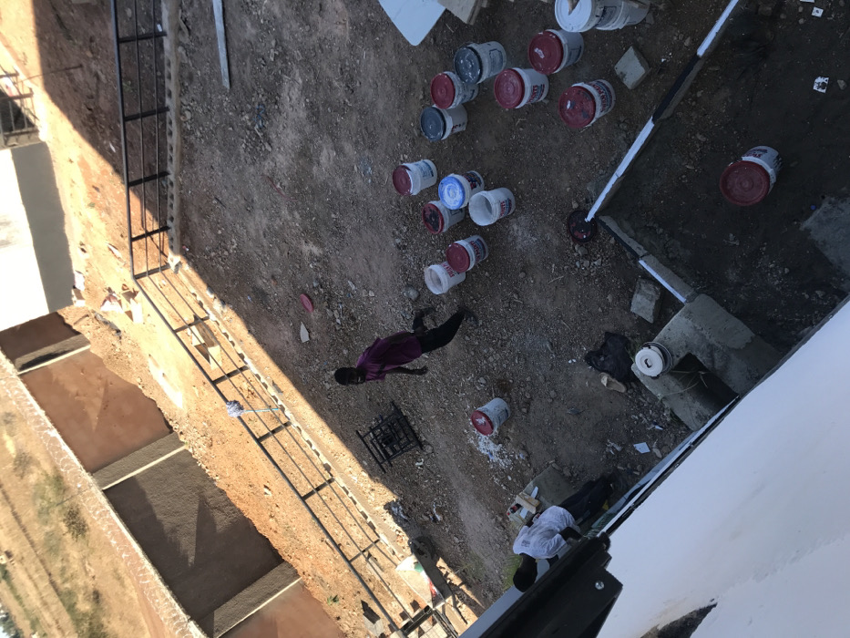 From a high-angle perspective, an outdoor area shows a person in a purple shirt walking amongst multiple paint buckets of varying colors. Another individual, wearing a white shirt, stands near a building's white exterior. A black metal ladder and fence structure runs alongside a building with layered platforms. The ground is covered in dirt and scattered debris, including small objects near the paint buckets.