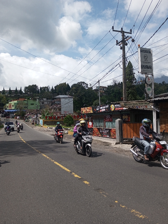 The scene depicts a daytime view of a paved two-lane road in Gubbisamamidi, India, under a partly cloudy sky. The asphalt road features a broken yellow center line. Multiple motorcycles and scooters are observed traveling along the road. In the immediate right foreground, a male individual operates a red motorcycle, wearing a blue helmet and light blue jeans, with his feet bare on the footrests. Adjacent to him, a silver-grey scooter is occupied by two individuals; the driver wears a yellow helmet and a dark jacket, while the rear passenger is clad in purple. Further back on the right, a red scooter with a single rider in a green helmet is visible. Along the right side of the road, commercial establishments are present, marked by multiple signs, including large "ALL YOU CAN EAT" banners displaying food images. Other signs read "KEDAI" and "MUSUK SENDIRI". A tall wooden utility pole stands prominently on the right, supporting numerous electrical lines and a vertical stack of commercial signs. This sign assembly features "FOOD COURT" at its apex, with additional logos and "HOTEL & RESTO" displayed below. On the left side of the road, additional motorcycles are visible, followed by a white van further in the distance. Buildings with varied facades, including green and light blue, line this side of the street. The background features dense green foliage on elevated terrain, leading to a distant ridge where structures and coniferous trees are discernible. A faint mountain range is visible in the far background.