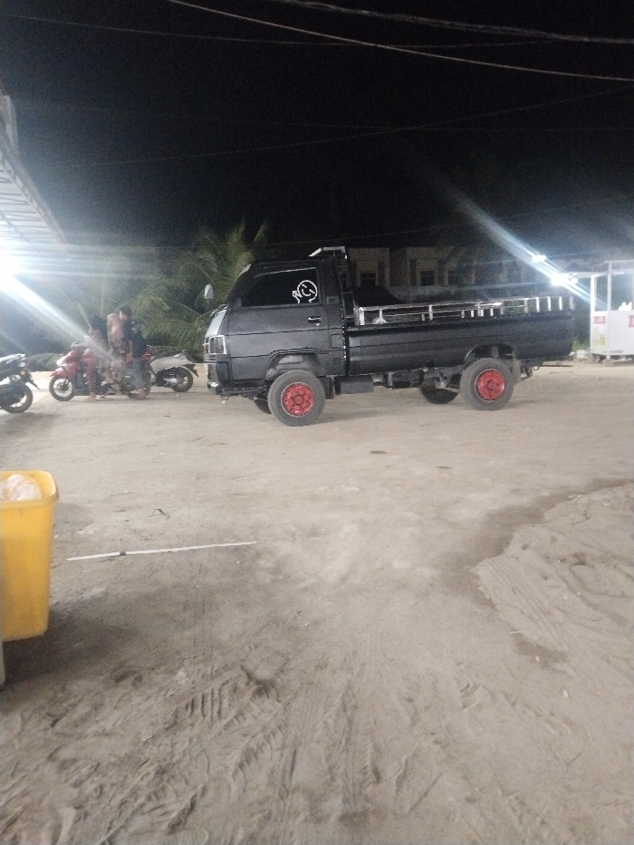 This nighttime scene, located in Keudebayu, Indonesia, depicts an outdoor unpaved area with several vehicles and individuals present. Dominating the right side of the image is a stationary black Mitsubishi L300 flatbed pickup truck, oriented towards the left, with distinctive red wheel rims on all four visible wheels. A white decal, appearing to be a cartoonish face, is affixed to the passenger side window. To the left of the pickup truck, a group of approximately three to five individuals is congregated near three motorcycles. Two motorcycles are dark-colored (one appearing red), and one is lighter. The individuals are standing, and their specific actions or interactions are indistinct due to distance and low light. In the immediate foreground on the left, a yellow plastic trash bin with a white plastic bag inside is partially visible. The ground is unpaved, consisting of dirt or sand, showing visible tire tracks and surface irregularities. Artificial light sources, positioned to the left and rear of the pickup truck, illuminate portions of the scene, creating lens flares. In the background, palm trees are visible, along with a multi-story building structure featuring several windows or openings. To the far right, a white kiosk or stall structure is partially visible. Overhead wires are discernible against the dark night sky.