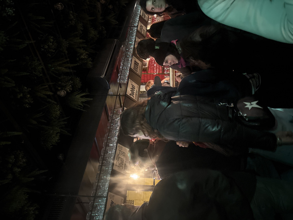 A dimly lit outdoor scene shows a crowd of people lined up at a vendor stall. The stall has multiple beer signs visible above rows of clear glasses. The people are dressed in winter clothing. Greenery is visible on the left side of the frame. Most are looking toward the vendor stall, likely waiting to order or be served.