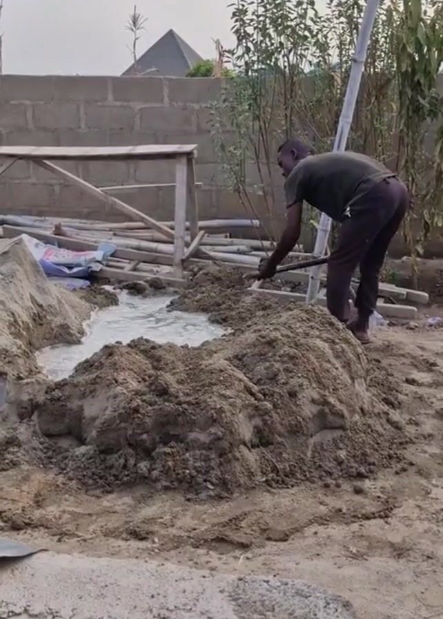 A man is mixing sand and water with a shovel. He is wearing a dark t-shirt and pants. The sand and water are in a large pile on the ground. There is a brick wall and some plants in the background. A wooden table and some construction materials are nearby. The ground is dirt.