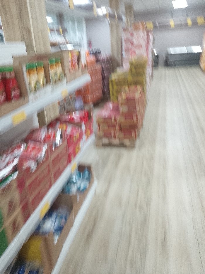 The scene depicts an interior view of a commercial establishment, likely a supermarket or grocery store, located in the city of Agani, Nigeria. The perspective is down a wide aisle featuring merchandise. On the left, white multi-tiered shelving units are stocked with various products. The top shelf holds several clear jars or bottles, some containing red substances and others a yellow or cream-colored substance. The middle shelf displays numerous red-packaged items, likely boxes or individual goods wrapped in clear plastic. The bottom shelf contains cardboard boxes, some of which hold clear bottles, possibly water, indicated by visible blue labels. Small yellow rectangular tags are affixed to the front edge of the shelves. The floor is light-colored, appearing to be a wood-effect laminate or similar material, with longitudinal plank patterns extending into the background. Overhead, bright rectangular light sources are visible on the ceiling. To the right of the aisle, multiple stacks of boxed products, predominantly red and yellow/brown, are arranged on wooden pallets, suggesting bulk storage or restocking. In the far background, a dark, horizontal refrigeration unit or display case is discernible along the right wall. No individuals are clearly visible within the frame, and no specific actions or interactions can be identified due to the overall significant blur present in the image.