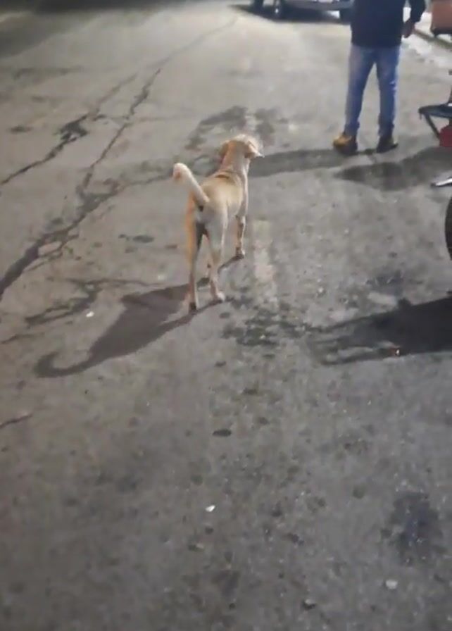 medium-sized, light-tan dog walking on an asphalt street at night. The dog is walking away from the camera, its tail wagging gently. A man wearing jeans and a dark jacket is standing nearby, holding a phone in his hand and seemingly recording the dog or something in the distance. There are several vehicles parked on the street, including a white car and a motorcycle. The street is cracked in several places. Some buildings and people are seen in the background, indicating an urban setting. The lighting is low, presumably street lighting.