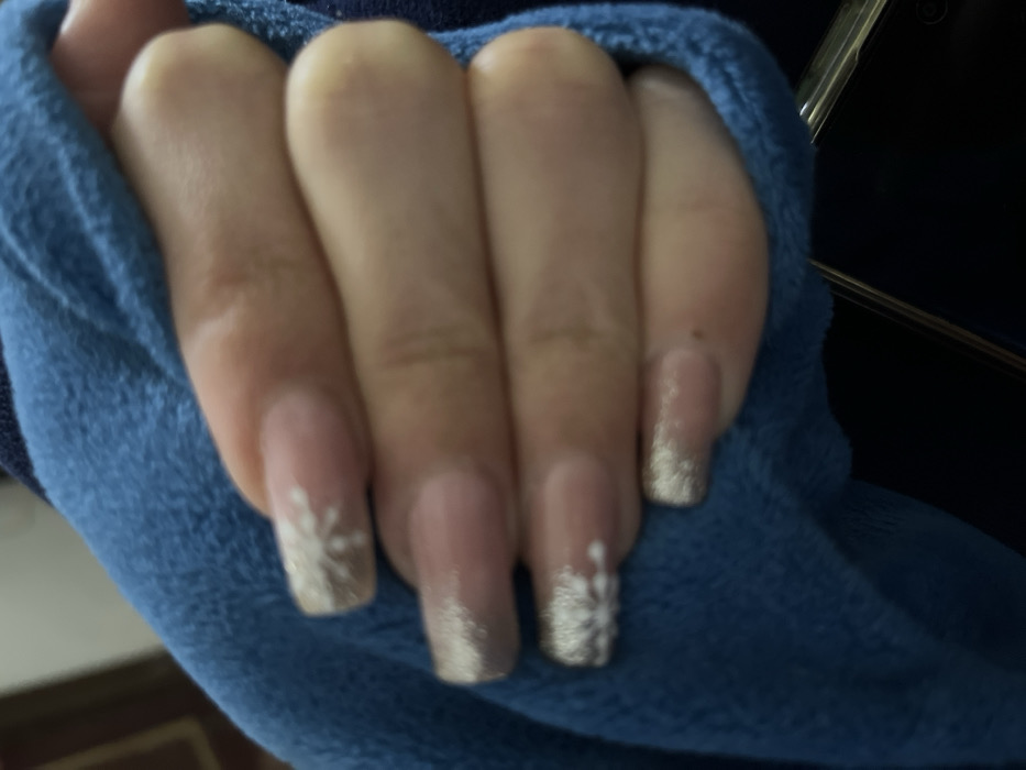 A hand displays four elongated, manicured nails. The nails are painted with a nude base and a glittery silver french tip. Two of the nails feature a small white snowflake design near the silver tips. The hand is partially wrapped in a soft, plush blue fabric, possibly a blanket or sweater. The background shows a dark, undefined object.