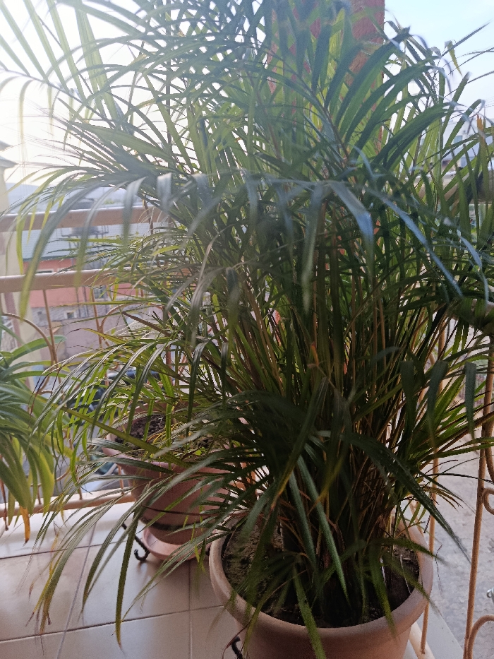 The image depicts an outdoor balcony scene in Abuja, Nigeria, featuring multiple potted plants. In the foreground, a large, dense palm-like plant with numerous long, dark green fronds occupies a terracotta-colored pot on a light-colored tiled floor. A beige or light brown metal railing with decorative scrollwork is visible behind and to the right of the main plant. A smaller, similar potted plant is partially visible to the left. The background reveals blurry outlines of urban buildings under bright, diffused daylight, suggesting a residential or commercial area. No people or observable actions are present in the static scene.