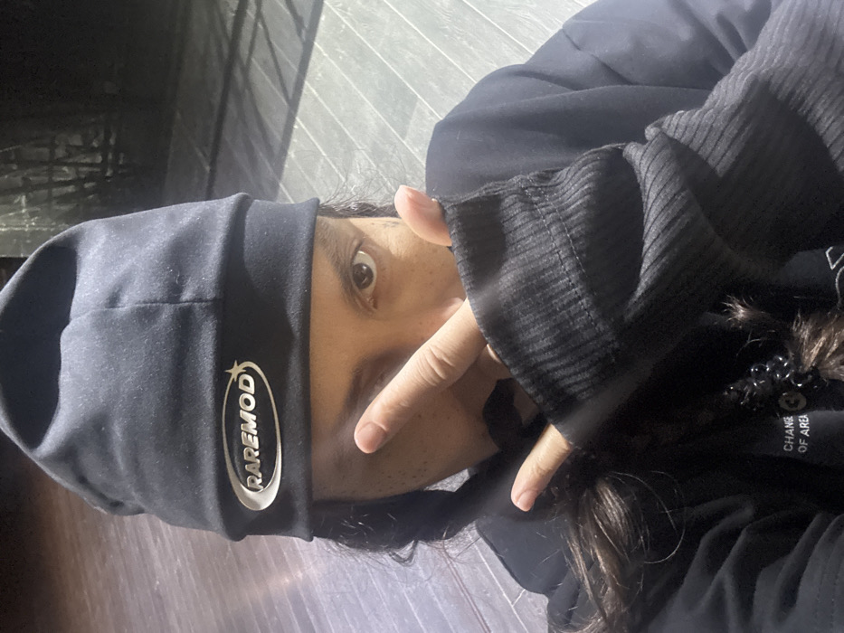 A close-up, dimly lit, frontal portrait depicts an individual in the city of Khimki, Russia. The person, with visible long dark hair, wears a black beanie featuring a white oval logo with "RAREMOD" text and a small star. Their left hand, covered by an extended black ribbed cuff, is held in front of their face, with the index and middle fingers extended upwards in a 'V' gesture, obscuring the lower face. The individual's right eye is directed towards the camera. They are wearing a black hoodie, revealing a dark, chain-link necklace and partial white text "CHANGE OF AREA" with a stylized '3' on the chest. The background is dark and out of focus, while the surface beneath appears to be light-colored horizontal planks or tiles, illuminated by a frontal light source.