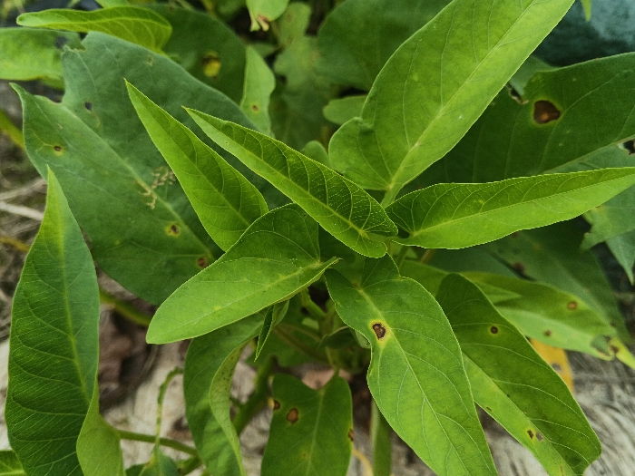 The image displays a close-up, high-angle view of multiple green plant leaves