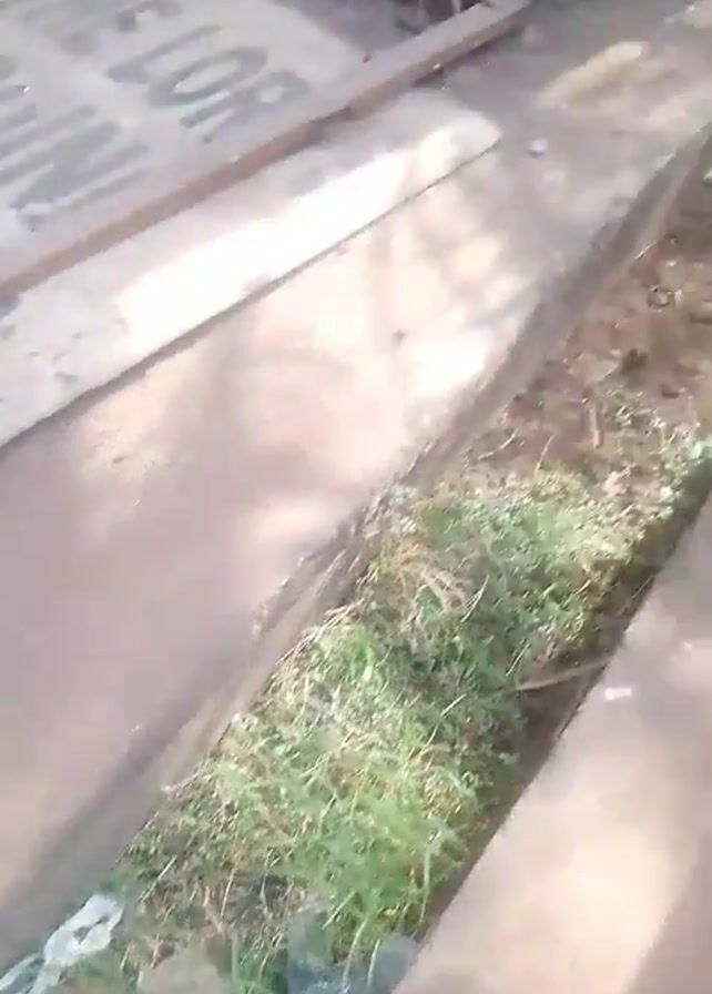 person standing by a concrete drainage ditch with some trash and weeds. They pan the camera up and across a street with parked cars of varying colors, including green, red, and silver.