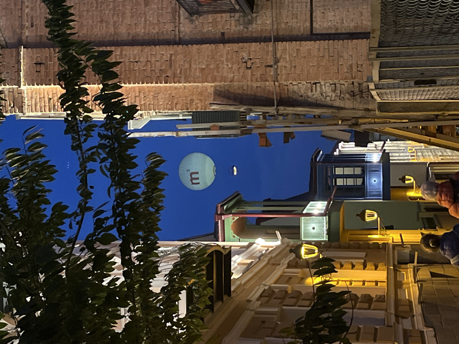 The image depicts a nighttime scene within a narrow urban passage in Tbilisi, Georgia. A prominent, light-colored hot air balloon displaying a red "m²" logo ascends against a dark blue sky; a smaller, dark, spherical object is visible beneath it. To the left, a multi-story building features light-toned facades and traditional wooden balconies with green and red accents, illuminated by multiple wall-mounted yellow lanterns. In the lower left foreground, two individuals are observed from behind, walking away; one is dressed in a blue jacket, the other in an orange jacket. The right side of the passage reveals a red brick wall, partially flanked by a temporary wooden construction structure. Dark green foliage partially overhangs the top and left of the scene.