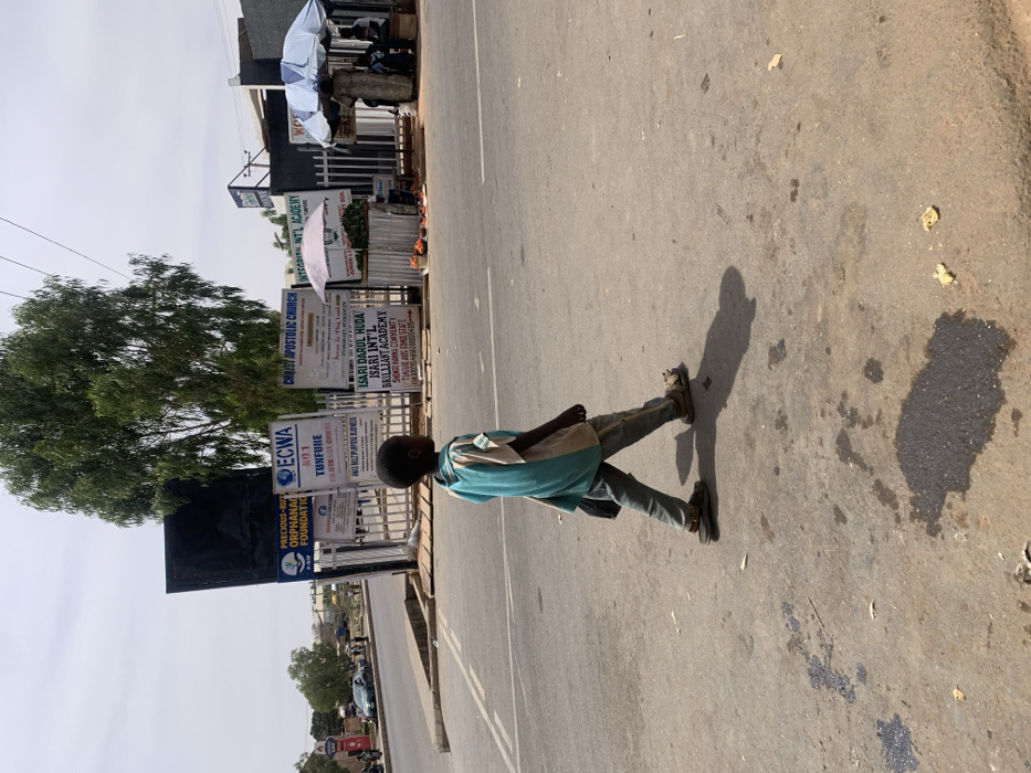 The image displays a daytime street scene in Gombe, Nigeria, specifically near Shagari Ward and Tunfure, as indicated by visible signage. A young Black male child, wearing a light blue and off-white short-sleeved top, light-colored long pants, and brown sandals, walks from right to left across a paved asphalt road. He carries a dark object in his left hand, and his shadow is cast to his left. The road surface exhibits minor wear, scattered debris, and dark fluid stains. On the right side of the road, behind a white metal fence, multiple advertising signs are erected. These include a large blank black sign, "PRECIOUS-RUTH ORPHANAGE FOUNDATION," "ECWA NO.1 TUNFURE," "CHRIST APOSTOLIC CHURCH," and "ISARI DARUL HUDA ISARI INT'L BRILLIANT ACADEMY SHAGARI WARD GOMBE STATE." Adjacent to the signs, two informal market stalls operate under light blue and white striped umbrellas. One stall prominently displays green produce and red items, likely tomatoes, on a low stand. Two adult figures are partially visible beneath the umbrellas, one dressed in a patterned garment. A large, leafy green tree stands behind the signs, and the sky is clear and light blue. In the distant left background, several vehicles are visible on a road, and rudimentary structures are present.