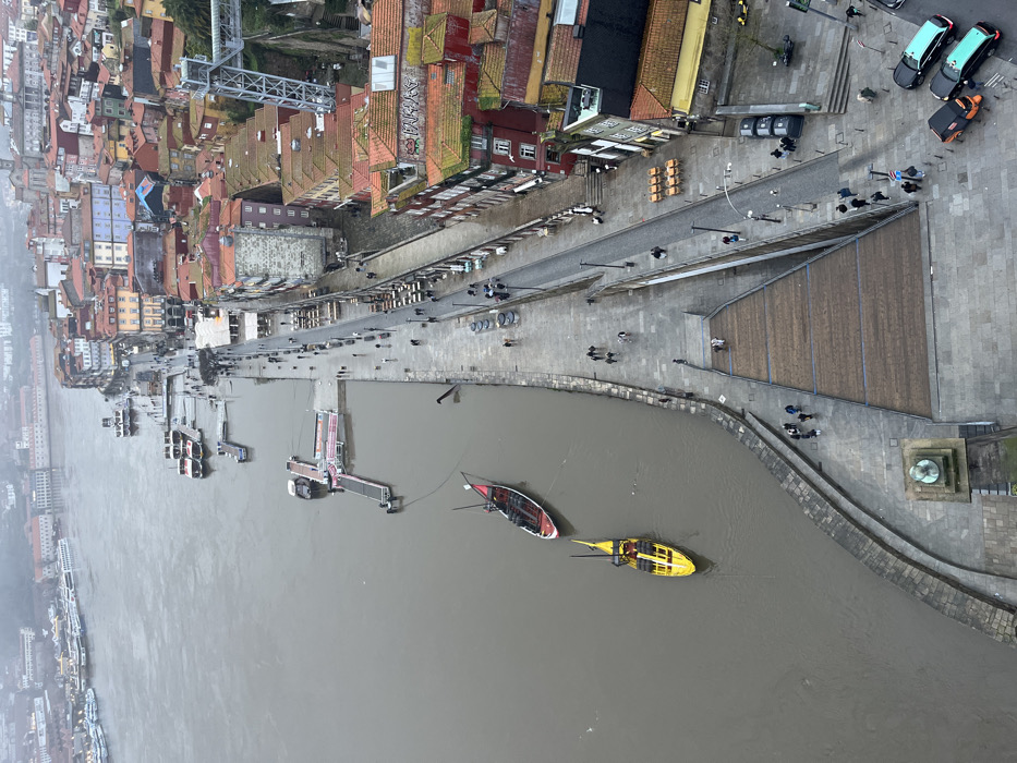 A high-angle shot reveals a city alongside a wide river. Buildings with red-tiled roofs line the waterfront, next to a paved walkway with people strolling along it. Several boats are docked or floating in the river, including a yellow vessel. A bridge structure is visible in the background, while buildings on the opposite bank are shrouded in mist. The river appears murky and reflects the overcast sky. Cars are parked near the edge of the walkway.