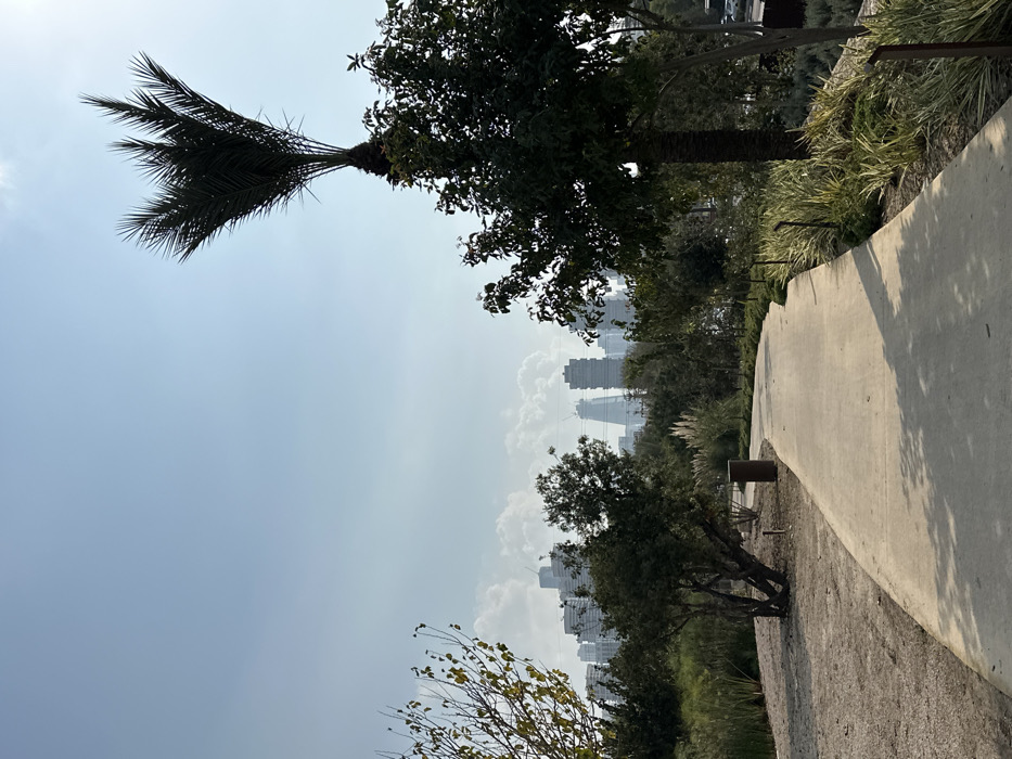 An outdoor scene depicts a paved path winding through a meticulously landscaped urban park under a clear, light-blue sky with sparse cumulus clouds. The location is Arieh Dulchin Park in Tel Aviv, Israel, offering a view northeast towards the city's modern skyline. In the foreground, a smooth, light-grey concrete path curves gently from the bottom center towards the middle ground, moving slightly rightward. Shadows from unseen overhead foliage fall diagonally across the path. To the right of the path, a manicured planting strip contains variegated green and cream-colored grasses, low shrubs, and several small, dark, upright pathway lights. A tall palm tree with a slender trunk and dense, spiky dark fronds dominates the right side of the frame, partially cropped at the top. Below the palm, darker green deciduous trees and shrubs are visible. To the left of the path, the ground transitions to a lighter-colored, sparsely vegetated area, possibly dirt or gravel. Further left, several multi-trunked trees with dark green leaves and a tree with lighter, yellowish foliage are present. A dark brown, cylindrical waste receptacle is positioned beside the path on the left, approximately midway through the frame. In the midground, a dense belt of various trees and shrubs forms a natural screen, beyond which the distant skyline of Tel Aviv is visible. The background skyline features numerous modern high-rise buildings, primarily in light grey and white tones. Two prominent, distinctive towers in the mid-right of the skyline, identified as the Azrieli Sarona Tower and adjacent Azrieli Town Square Towers, exhibit unique, segmented facades. One of these towers shows construction cranes at its apex. The scene is illuminated by bright natural sunlight, indicating daytime. No individuals or discernible actions are present in the image.