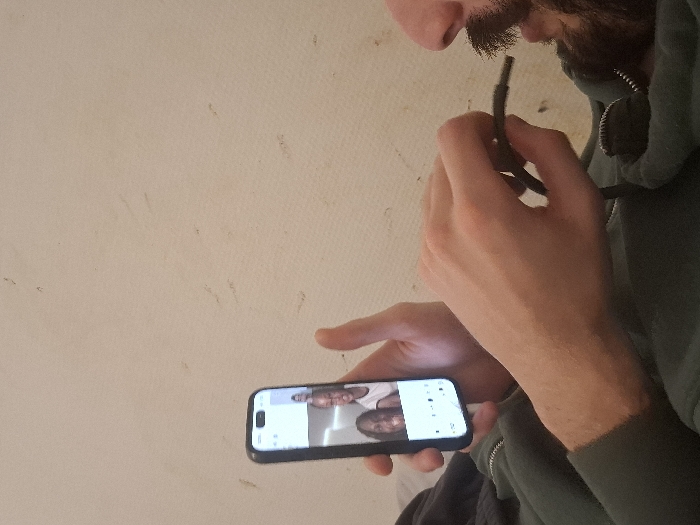 A person with a beard is holding a black cable close to their mouth. They are also holding a smartphone in the other hand, displaying a video call with two people. The person is wearing a green hooded sweatshirt. The background is a plain, light-colored wall with some slight imperfections. The overall composition suggests a casual, indoor setting.