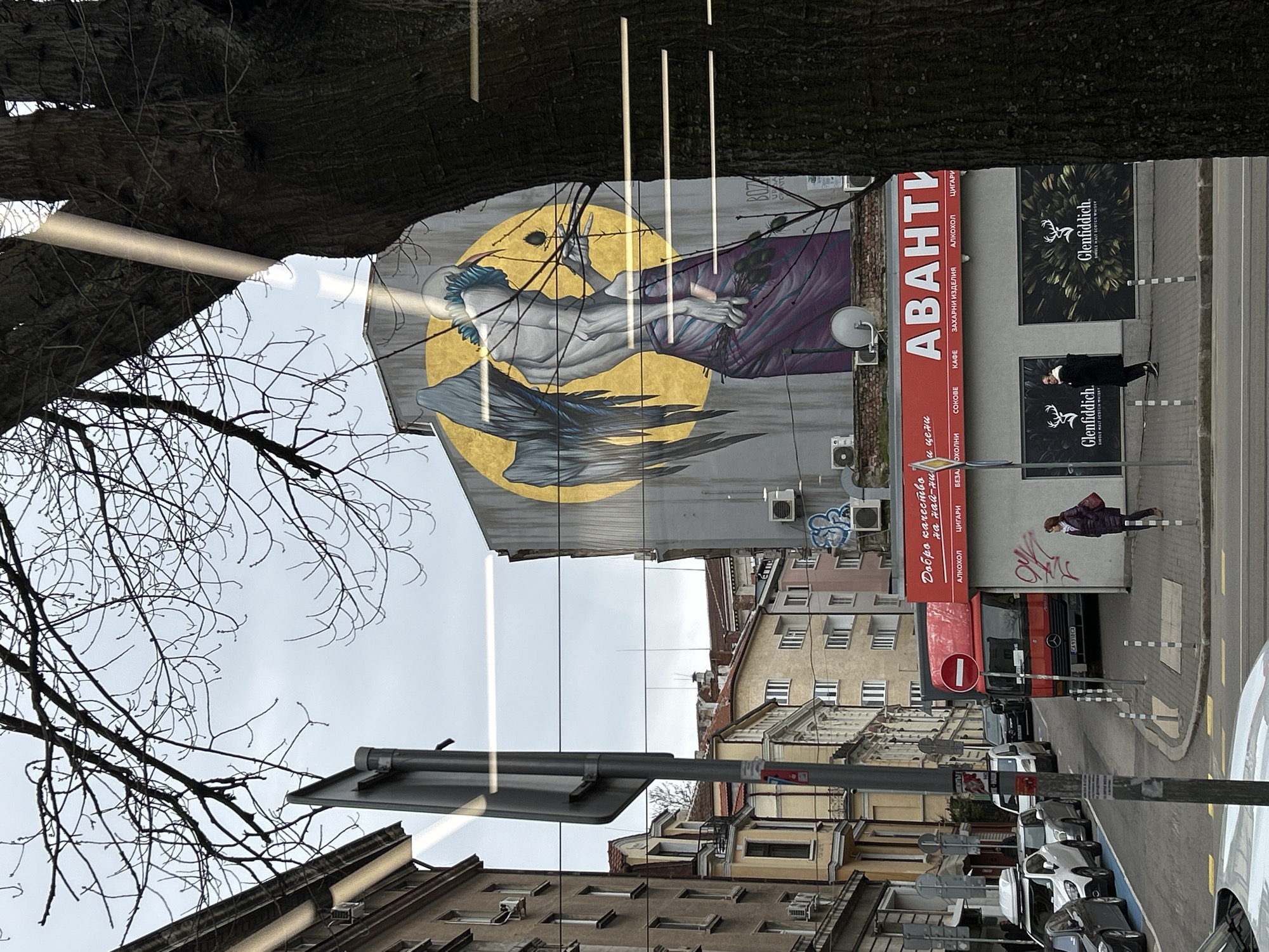 Here is a description of the image: The image captures a street scene in Sofia, Bulgaria. A tall building with a large mural dominates the view, depicting a figure against a yellow background, likely an artistic rendering of a mythical or symbolic subject. In front of the mural-adorned building, an advertisement for "АВАНТИ" (Avanti), offering goods ranging from alcoholic beverages to pastries, is visible. Below the Avanti sign is a license plate number "CA9310CX". Across the street, advertisements for "Glenfiddich" single malt scotch whiskey flank a pedestrian walking. Several pedestrians are visible on the street, along with parked cars and street furniture. The scene is partially framed by a tree, with branches reaching into the view. The overall lighting suggests an overcast day. The image suggests a bustling urban environment, blending commercial advertising, street activity, and urban art.