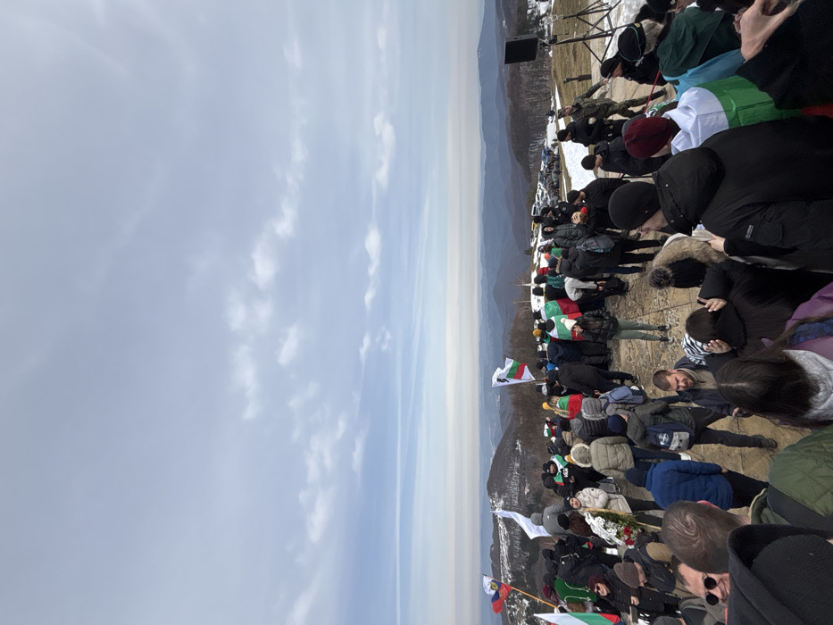 The image displays a large outdoor gathering of approximately 100-150 individuals on a mountain summit or pass identified as the Shipka Pass, near the city of Shipka, Bulgaria