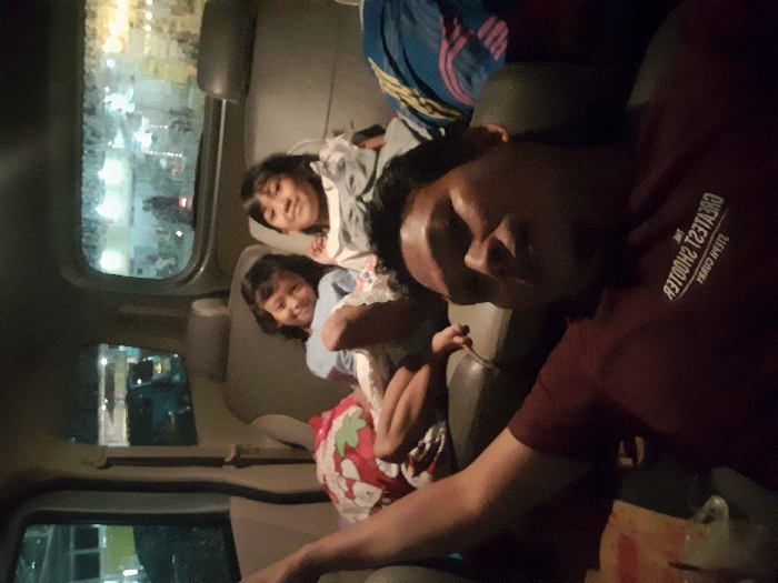 The image captures three individuals inside the passenger compartment of a vehicle, likely a minivan or SUV, at night in Balonggabus, Indonesia